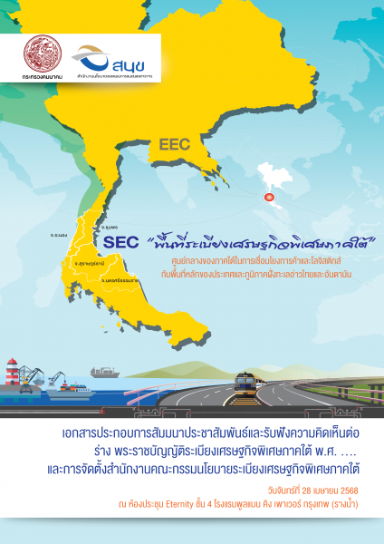 ขอเผยแพร่เอกสารประกอบการสัมมนาประชาสัมพันธ์และรับฟังความคิดเห็นต่อ ร่าง พระราชบัญญัติระเบียงเขตเศรษฐกิจพิเศษภาคใต้ พ.ศ. …. และการจัดตั้งสำนักงานคณะกรรมการนโยบายเขตพัฒนาพิเศษภาคใต้